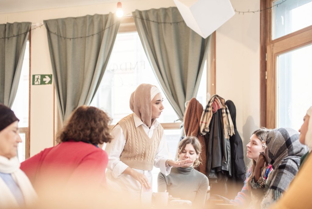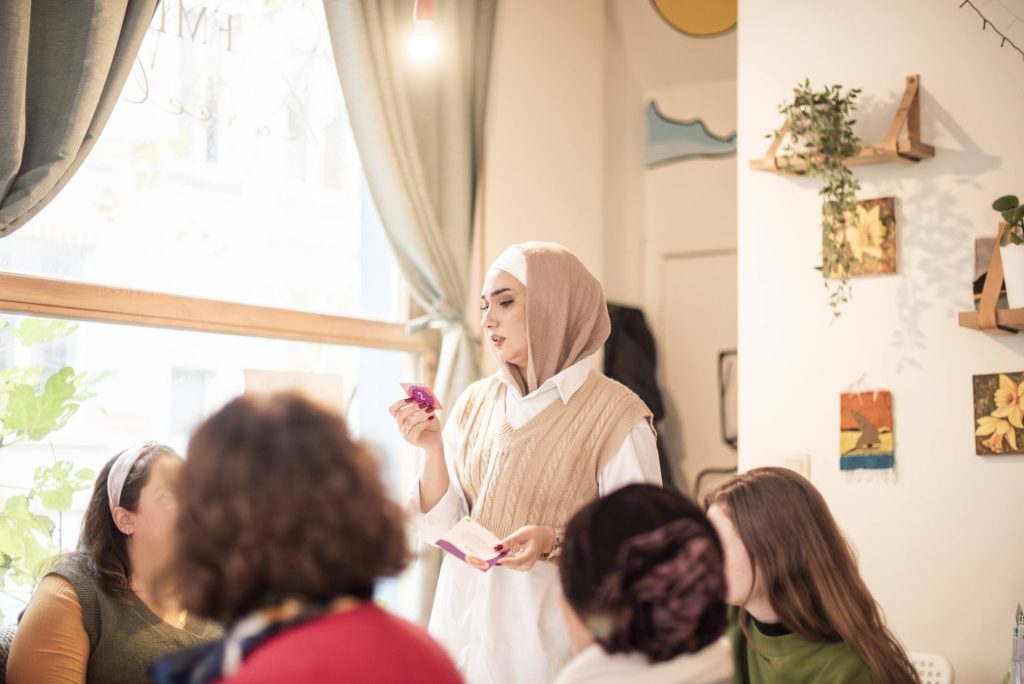 Nour werkt als vrouwenambassadeur bij FMDO*. Deze vrouwenambassadeurs delen hun ervaring en kennis over vrouwenrechten, grensoverschrijdend gedrag en discriminatie met andere vrouwen met een migratieachtergrond aan de hand van een educatief spel. Op die manier vormen ze een voorbeeld voor deze vrouwen en engageren ze zich om deze thema’s bespreekbaar te maken en aan te kaarten. Dit vrijwilligerswerk biedt haar de kans andere vrouwen te ondersteunen.